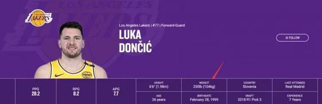 湖人官方即时更新了东契奇的数据,现在体重为230磅(104.3公斤),比去年最高270磅(122.5公斤),轻了足足有36.4斤。